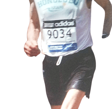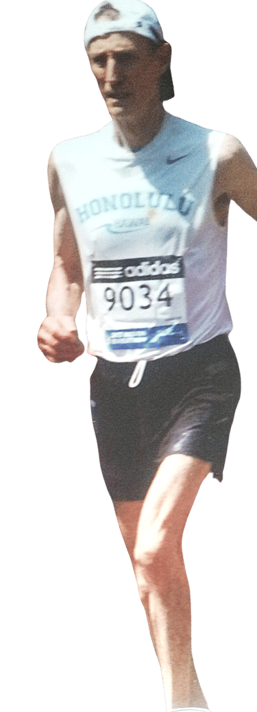 Oahu is the most populous island in the Hawaiian chain, and I had lived on its far west end for about 15 years before moving to Honolulu to avoid the 90-minute commute. Living adjacent to the downtown area, I often opted to bike to the bank or post office, rather than drive. In early 2007, a bike accident left me limping for well over a year. Having already set aside all my physical activities for work, I was now prevented from even walking. Thus, in July of 2008, I chose to gather what I had learned of somatics from my work and apply it via a focused awareness approach to walking, with the hope of restoring my knee. I was surprised to find I limped less when I tried to jog than when I walked, and eventually jogged my way back to a full recovery. Walking with some runners one afternoon, I mentioned, "It would be cool to run Boston someday," and they laughed at me. The Boston Marathon requires qualifying times and remains on many people's bucket list for a lifetime. I had once been a decent runner, and I felt their response burning in me all the way home. I registered that night for December's Honolulu Marathon. The April 2009 Boston Marathon registration window thankfully remained open til February that year. These past events I've described each played a role in how I happened upon our artist, and how our two stories became intertwined.